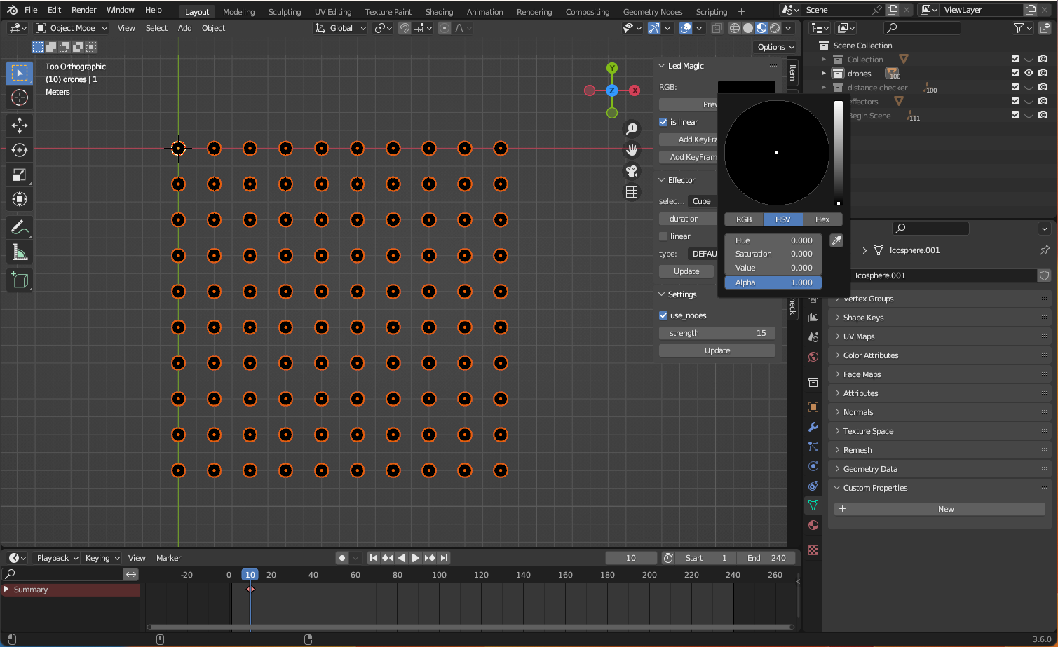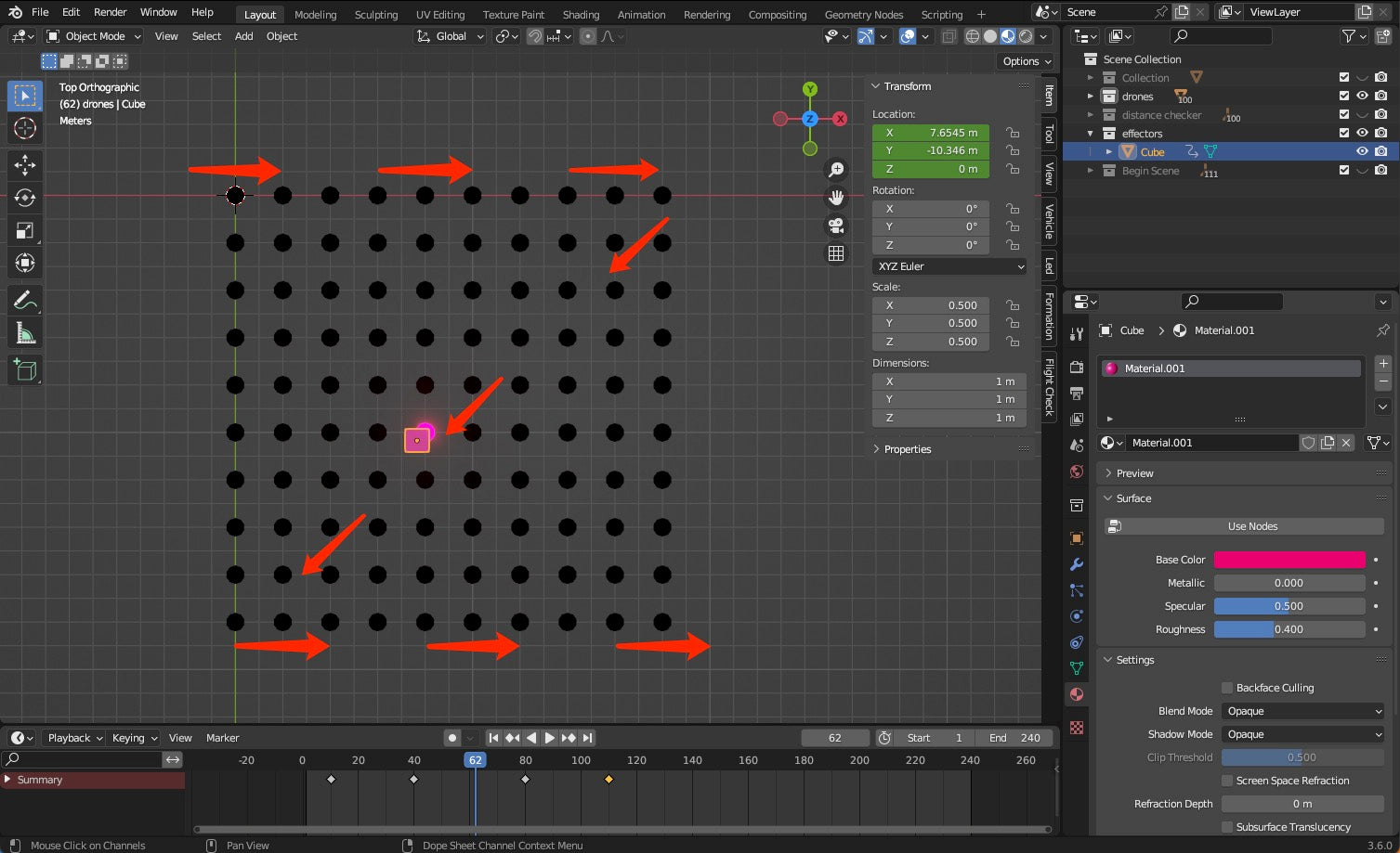 Here we add a Cube to the effectors collection and make a “z” animation. In the Material Properties, add a base color to the cube. The drone will have the effector color only when it intersects with the cube.