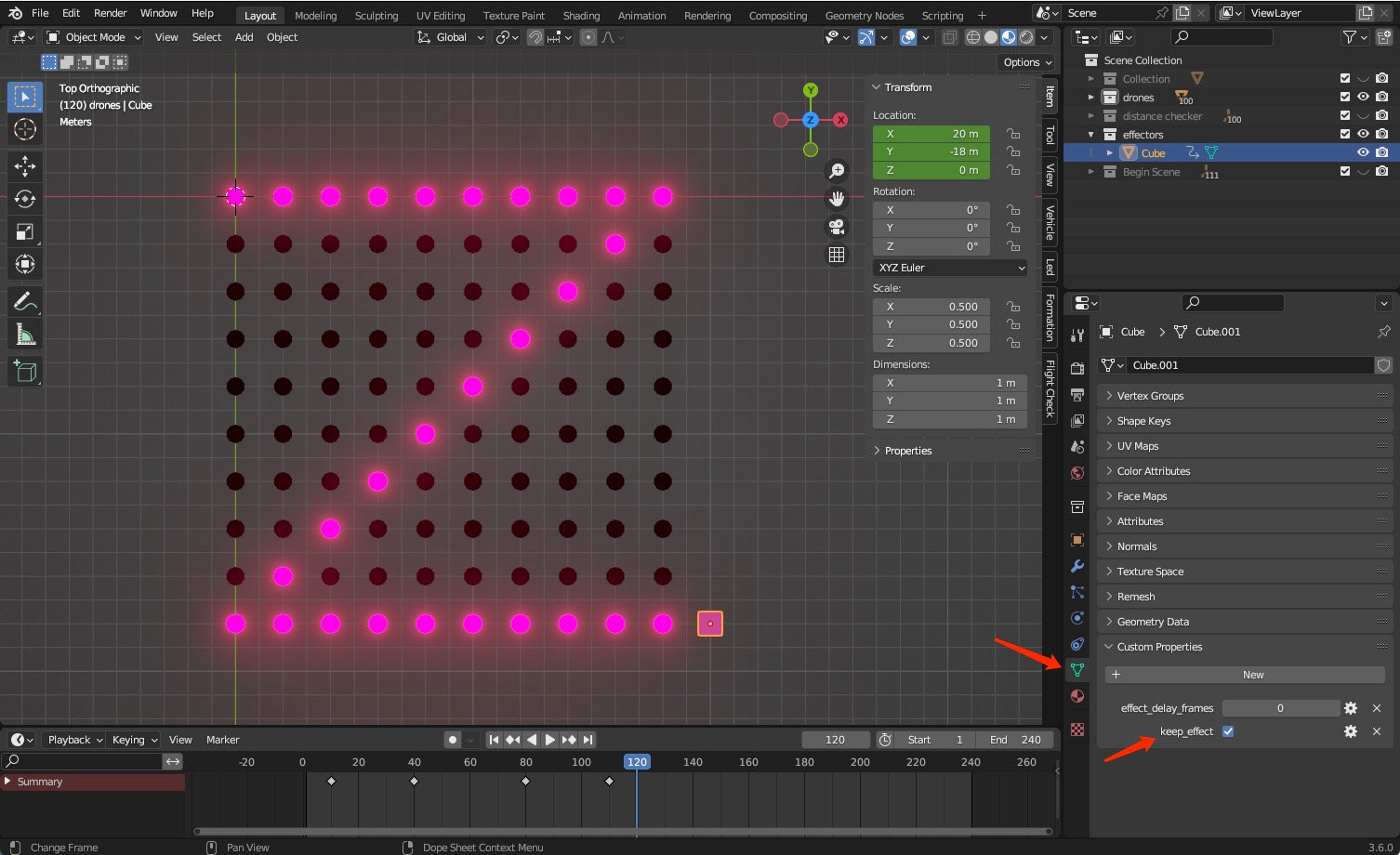 If we set a value for effect delay frames, for example 150, that means the drone will keep the color when the effector cube passes by for 150 frames, and then it will change the current color of the effector cube.