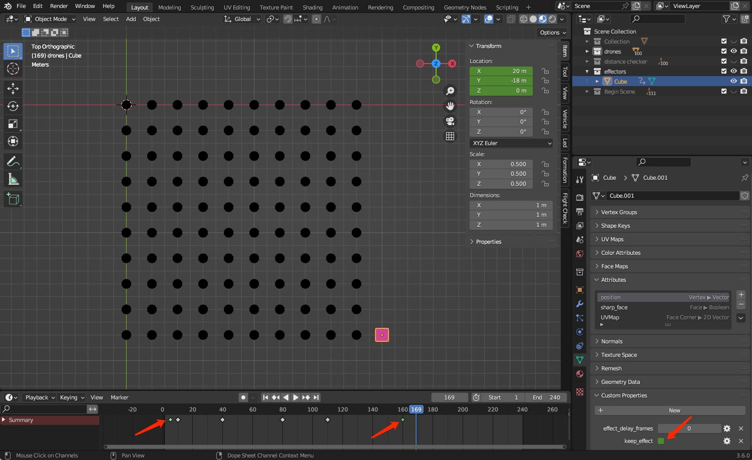 Click Date Properties, and make a “✓” with the keep_effect. Play the animation, the drone will leave color traces when the effector cube passes by.